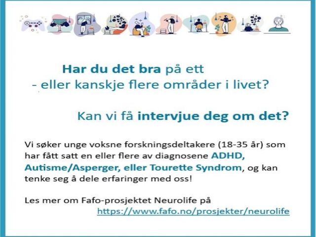 Vi søker unge voksne forskningsdeltakere (18-35 år) som har fått satt en eller flere av diagnosene ADHD, Autisme/Asperger, eller Tourette Syndrom, og kan tenke seg å dele erfaringer med oss.