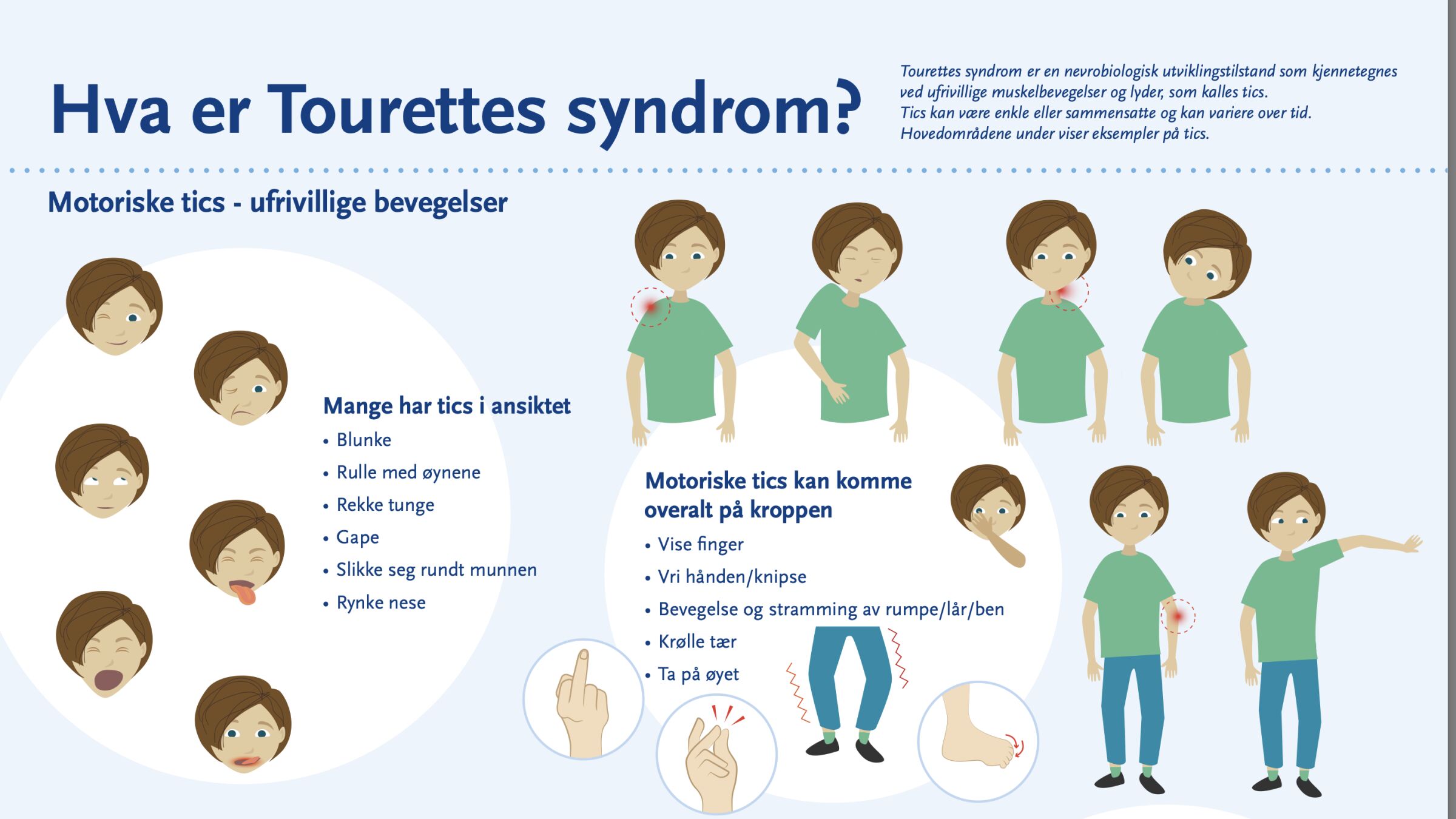 - er plutselige, ufrivillige, raske, gjentatte, formålsløse bevegelser og lyder.